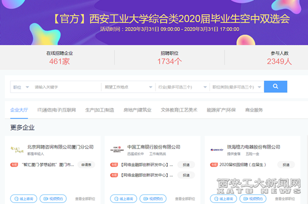 当前正处“金三银四”就业关键期,为毕业生提供充足就业机会。据悉,学校还将于4月份举办三场空中双选会:西安市软件园IM在线专场空中双选会会、女生专场空中双选会、文科综合类空中双选会,积极推进2020届毕业生就业工作。