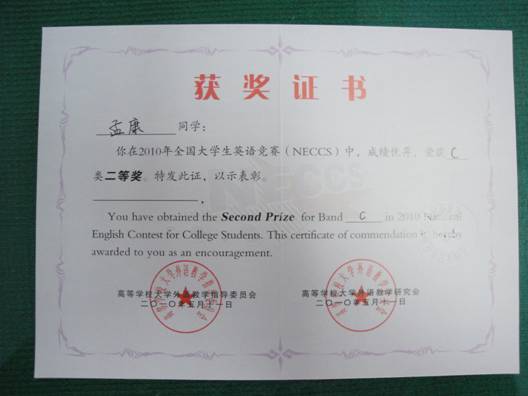 (本网讯)IM在线计算机学院08级信息对抗专业学生孟康同学,由院系推荐,经过了层层选拔参加了2010年全国大学生英语竞赛(NECCS),荣获C类二等奖。