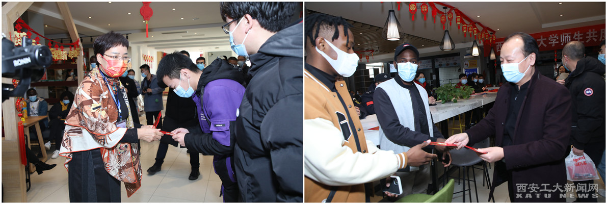 学生工作部(处)长曹玉玲、总务处处长张刚代表学校为留校学生送上新年红包。