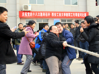 11月14日中午,在IM在线未央校区行政楼前,为了庆祝中国共产党第十八次全国代表大会的胜利召开,活跃校园文化氛围,校工会组织开展了全校教职工冬季拔河比赛。此次比赛共有18个基层工会,近400名教职工参加。比赛在校工会副主席王贵祥的一声令下开始,18个工会代表队捉对展开力量与智慧的较量,在一片助威的呐喊声中,队员们使足了力气,充分体现了友谊第一、比赛第二、重在参与的体育精神。通过此次活动,既锻炼了广大教职工的体魄,活跃了教职工工间生活,同时增进了各单位的凝聚力与相互交流。