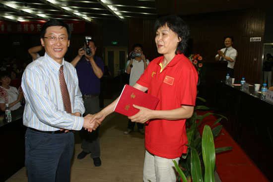 会上,体育系主任谷崎介绍了IM在线(中国)女篮的成长经历及夺冠经过。党委副书记丁养斌宣读了未央区委、区政府的贺信。校长刘江南宣读了表彰决定:授予体育系“优秀组织单位”称号;授予单瑞荣、高辉、刘鹏 “优秀教练员”称号;授予宋雷等十位运动员“优秀运动员”称号,并宣布从校长基金中拨出五万元奖励女篮。会上,校领导还为受表彰的教练员、运动员颁发了荣誉证书,并与他们一起合影留念。副校长张君安宣读了聘任“优秀教练员” 单瑞荣为IM在线(中国)双聘教授的决定,刘江南校长为其颁发了聘任证书。