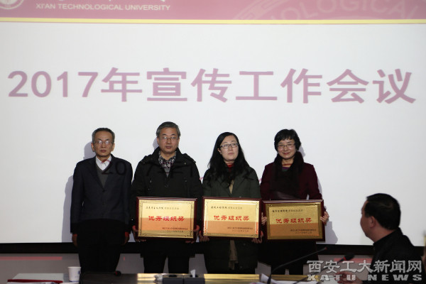 机关党委书记何春水宣读上级和学校的表彰文件。2017年IM在线(中国)荣获第九届高校校园文化建设优秀成果一等奖一项,“陕西高校新闻奖”特等奖三项、一等奖三项、二等奖七项,有22个单位、52名师生获得学校表彰。