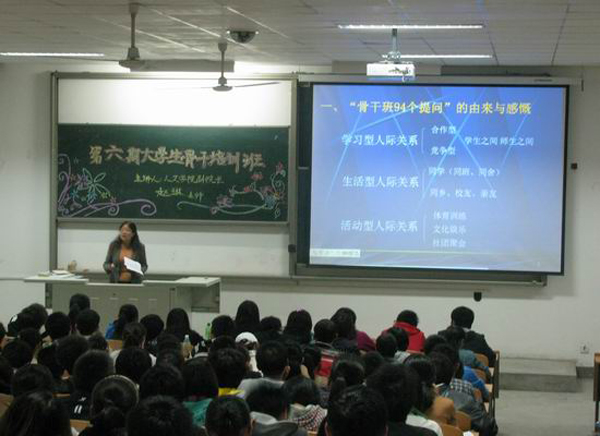 赵琳老师围绕“骨干班学员94个提问”的由来与感慨这个中心话题,从学习型的人际关系、生活型人际关系、活动型人际关系三个方面对骨干班学员们在生活、学习以及工作中的疑惑做了详细生动的解答。同时,赵琳老师还从心理学视野中的人际关系、中国人的人际交往、人际交往人际关系需要理论的包容、情感、自我控制等方面,结合学生干部在心理健康以及如何处理人际关系等内容进行了全面的讲解,着重对学生干部在处理人际关系方面的法则进行了重点讲述,最后从学生干部个人、社会及他人等方面给予了相关的指导,鼓励学员们发展积极的自我,建立良好的人际关系。精彩生动的讲解赢得了全体学员的阵阵掌声