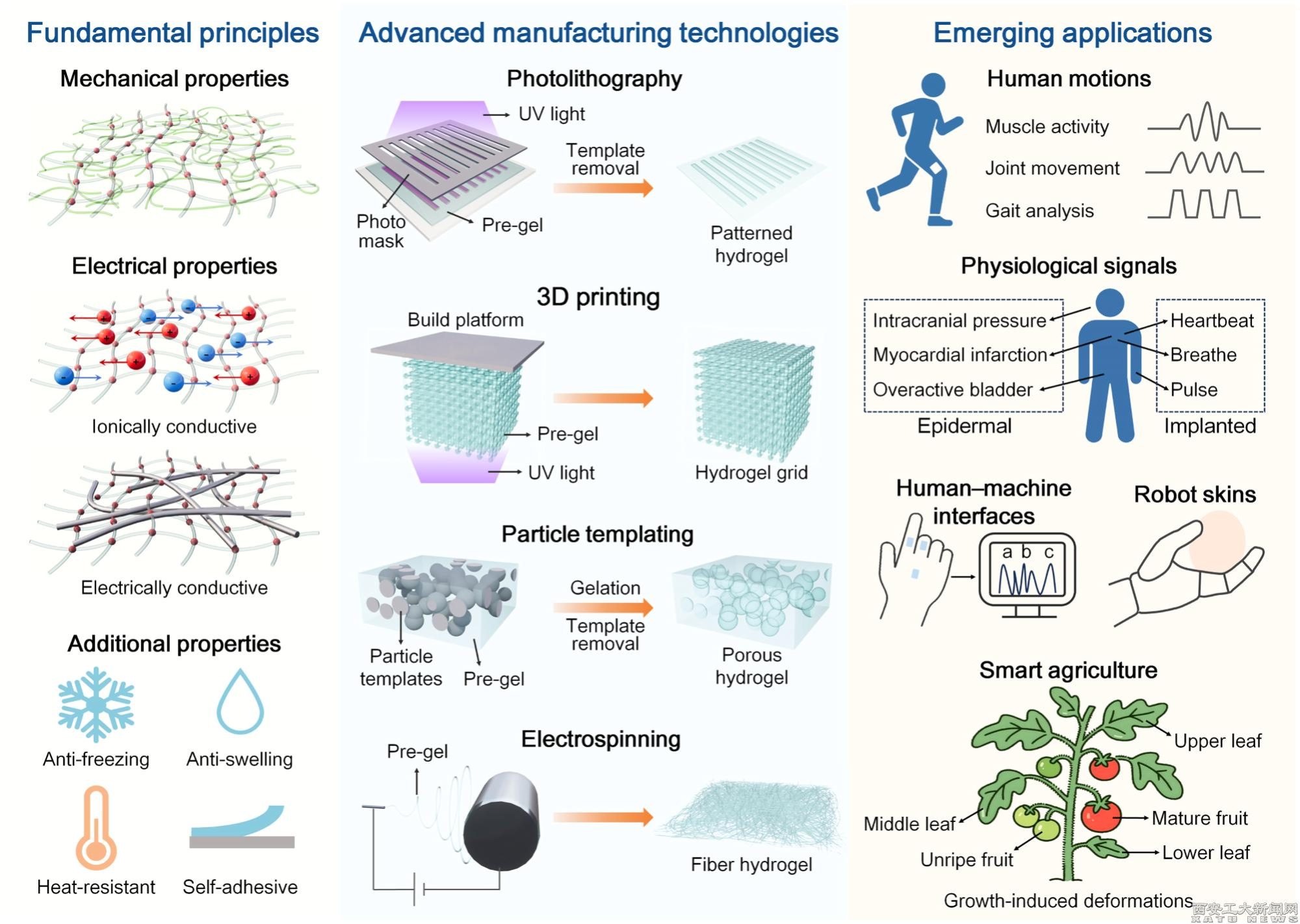 该论文系统评述了用于柔性力学传感器的导电水凝胶的设计原理、功能化策略和先进制造方法,并展望了凝胶力学传感器的应用前景。系统介绍了离子导电水凝胶、本征导电聚合物水凝胶和导电填料复合水凝胶的导电机制、性能优化策略与代表性研究进展;详细论述了光刻、模板铸造、3D打印、纤维化等多种微结构加工技术在导电水凝胶的快速和精准制造方面的研究进展;深入探讨了基于导电水凝胶的柔性力学传感器在人体运动监测、生理信号监测、人机交互及智能农业等领域的广泛应用。