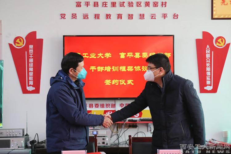 王发合代表学校与王锋签署《干部培训框架协议》。学校党办、校办(乡村振兴办)主任何春水代表学校与陈兴运签署《黄窑村产业帮扶包装设计协议》。