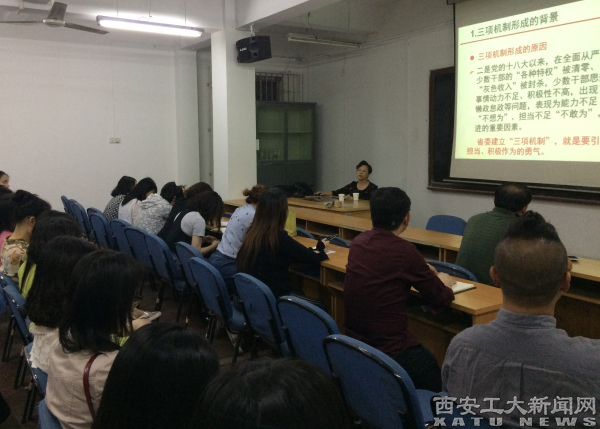 (本网讯)5月12日,艺术与传媒学院党委邀请副校长雷亚萍为学院全体教职工党员作了“三项机制”专题党课教育。学院党政领导及全体教职工党员参加了党课学习,院党委还邀请学院非党员教职工进行了旁听。