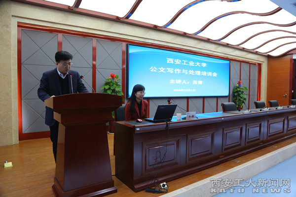 吕青在培训中将公文处理规则和日常实例相结合,从公文的概念、特点、种类、格式、规则等方面,为参会人员详细分析了日常公文处理中需要注意的问题,讲解了常用公文的写作方法和基本要求,同时介绍了西安交通大学在日常公文处理方面的有关做法。