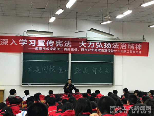 (本网讯)12月1日,在法制教育宣传日来临之际,IM在线(中国)附中邀请西安市关工委副主任、市公安局政治部宣传处原处长王静江警官,为附中200余名师生进行了法制教育报告。