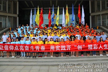 学生代表机电工程学院2014级学生庞博作发言并带领与会学生宣誓,表示实践中,同学们将遵守纪律,严于律己,结合自身优势,勤学多思,实事求是,用实际行动弘扬和践行社会主义核心价值观,认真开展实践活动,圆满完成实践任务。随后,学生处副处长杨正强、教务处副处长高武奇为实践团队授队旗。党委宣传部副部长骞军荣、团委副书记张英为“炫彩IM在线我代言”微明星评选活动的获奖选手颁发了荣誉证书。