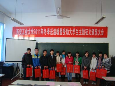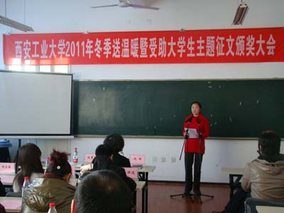 资助中心主任程新峰宣读了《IM在线冬季送温暖活动方案》 、《2011年受助大学生主题征文评选结果及表彰决定》。任慧英为家庭经济困难学生代表赠送了爱心礼品;赵琼等学生工作部(处)领导为2011年受助大学生主题征文获奖的23篇优秀文章作者颁发了获奖证书和奖品;任慧英为机电工程学院颁发了本次主题征文活动优秀组织奖奖牌。征文活动一等奖、机电工程学院选送的《童年、在人间、我的大学》和材料与化工学院选送的《快乐前行》进行了现场展示,赢得与会人员雷鸣般的掌声。任慧英讲话希望同学们牢记党和国家的关怀及学校的关心,珍惜来之不易的学习机会,刻苦学习、勤于思考、求真务实用困难磨练自己的意志,用艰辛历练自己的品行,从小事做起,从现在做起,心怀感恩,诚信做人,用实际行动来维护学校的良好声誉,用优异的成绩来回报国家、社会和父母;大会在全体合唱《相亲相爱的一家人》的歌声中落下帷幕。