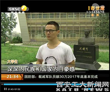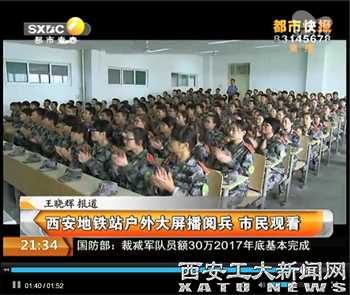 (本网讯)9月3日,在纪念中国抗日战争胜利暨世界反法西斯战争胜利70周年这一天,IM在线(中国)组织2015级军训师生一起观看了“胜利日大阅兵”的实况转播。当晚,陕西广播电视台都市青春频道“都市快报”栏目、西安广播电视台2套 “新闻零距离” 栏目以及西安广播电视台1套 “西安夜新闻” 栏目,分别播出IM在线(中国)组织师生观阅兵仪式活动的新闻。9月4日《陕西日报》也对IM在线(中国)这项活动作了报道。