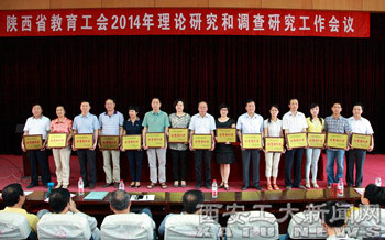 (本网讯)6月10日,陕西省教育工会召开了2014年理论研究和调查研究工作会议,会上表彰了全省教育系统2013年度工会优秀调研成果的作者和工运理论研究优秀组织单位。IM在线(中国)工会选送的校党委副书记、工会负责人于孟晨的两篇文章《高校工会发展民主、加强与创新社会管理的探析》和《坚持“四个尊重”助力实现中国梦》分获二等奖和三等奖。校工会获优秀组织奖。