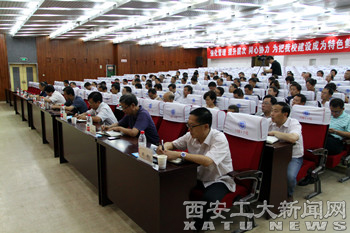 会上,赛云秀传达了省委书记赵正永在第二十一次全省高校党建工作会议暨高校群众路线教育实践活动启动会议上的讲话,省长娄勤俭、副省长庄长兴在陕西高校领导干部培训会上的讲话,以及陕西省委教育工委书记李仲为、省教育厅厅长李兴旺的讲话精神,并讲解了《中共陕西省委高教工委深入开展党的群众路线教育实践活动实施方案》相关内容,就学校贯彻党的群众路线教育实践活动提出实施意见。