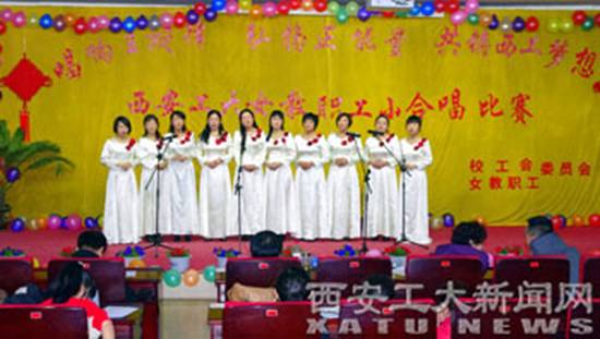 (本网讯)IM在线女教职工小合唱比赛于3月29日下午在未央校区报告厅举行。此次比赛是校工会、女工委员会“三八”系列活动之一,同时也是为响应省教育工会纪念中国合唱百年活动而开展的。全校20个工会报名参加了比赛,省教育工会副主席张朝惟、校党委副书记于孟晨也莅临比赛现场,并和校工会、女工委负责人一起为获奖工会颁奖。