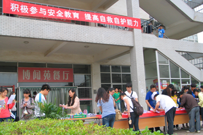 为增强宣传效果,总务处准备了宣传横幅、签名横幅,安全知识手册等资料。当每一位学生或教职工经过宣传台时,宣传人员主动向他们发放防灾减灾安全知识手册,宣讲防灾安全知识的必要性和重要性。同时,请师生们在写有“弘扬防灾减灾文化,提高防灾减灾意识”的横幅上签名,不到一个小时的时间,条幅上就已经签满了师生们的名字。