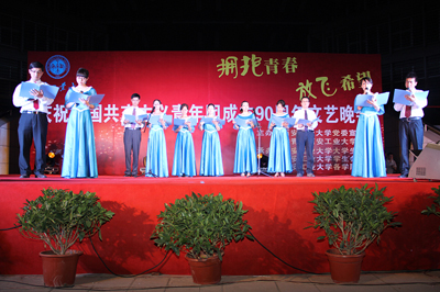 火红的服装,优美的舞步,大学生艺术团热情四射的现代舞《如火的青春》拉开了晚会的帷幕。唯美的大型舞蹈《映山红》,展示了先辈们投身革命的可歌可泣的精神以及那段红色的历史;器乐演奏《茉莉飘香》仿佛吹进了一股让人陶醉的清新气流;歌舞《幸福山歌》让大家在激昂的歌声中感受到幸福生活的美好和祖国未来的美好;校工会教师王小钰以天籁之音演绎的《在那东山顶上》,让观众们领略到了祖国山河的壮美和高山草原的魅力;校园歌手轻快的校园民谣,动感十足的街舞,韵律十足的健美操,令人回想起记忆中最纯真的年代,释放着青春的气息;小品《家的N次方》,通过志愿者们的爱心服务,诠释了传承雷锋精神、参与志愿服务、无私奉献的高尚品格;团干部们满怀深情的诗朗诵《团旗飘扬》,表达了广大团干部积极投身祖国建设、学校发展的豪情壮志,表达了对共青团深厚的感情,把气氛推向了高潮。晚会在大学生艺术团的合唱《光荣啊!共青团》嘹亮的歌声中落下了帷幕,整个会场沉浸在一片欢乐的海洋中。