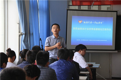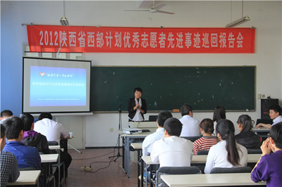 (本网讯)4月25日,在共青团陕西省委志工部部长助理宋朝的带领下,2012年陕西省西部计划优秀志愿者报告团来到IM在线举办了先进事迹报告会。“激扬青春·奉献西部”宣讲团代表及IM在线(中国)学生代表参加了报告会。报告会由校团委副书记张英主持。