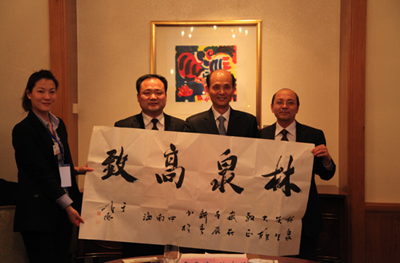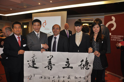 会后,中华人民共和国驻比利时大使廖力强与代表团成员进行亲切交流。于唯德教授代表参会人员赠送书法作品,一幅“德立善达”的行书作品,受到了大使和工作人员的啧啧称赞,增进了彼此间的友情。