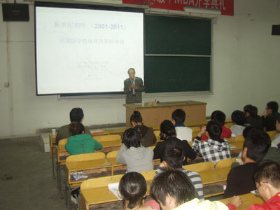 曲宗湖教授从“中央七号文件”的落实情况、汶川玉树和日本大地震的痛定思痛、北京奥运会的辉煌对学校体育的反思、新世纪体育课程改革之我见四个方面阐述了旨在加强青少年体育工作、增强青少年体质的“中央七号文件”精神,强调了安全教育、健康教育要落实到学校的教育纲领中,指出了我国学校体育改革存在的问题、内容和趋势等问题,提出体育走向必须做好从“金牌第一”朝“生命至上,健康第一”的战略转移。最后曲教授与同学们就体育教育改革等方面的问题进行了互动。