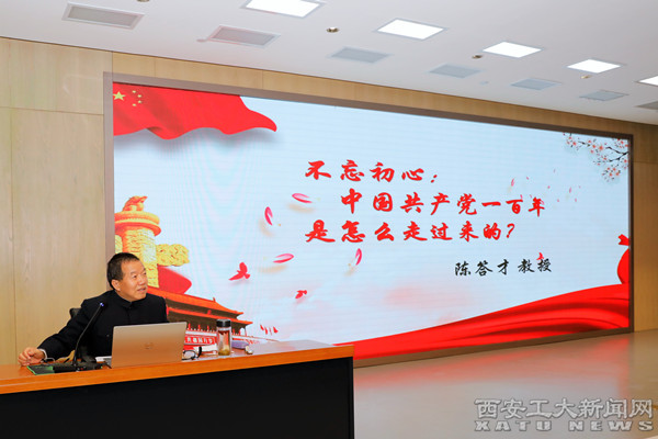 陈答才教授分别从我党不断取得的伟大胜利、进行的伟大斗争、建设的伟大工程以及对中国共产党第二个“一百年”的远景思考这四个方面,详细地讲述了中国共产党从成立至今的辉煌历程。