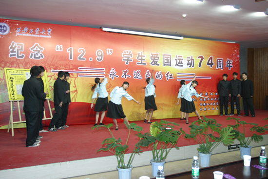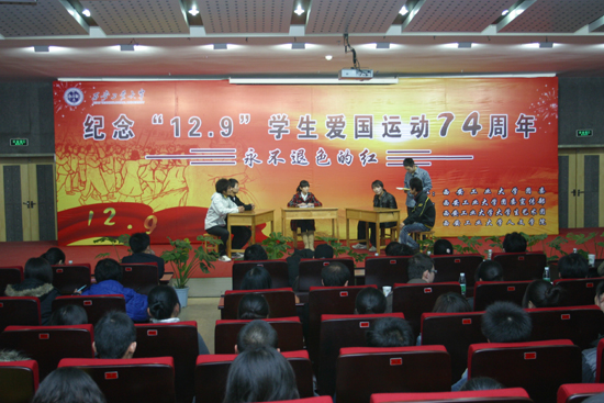 晚上,由校学生自编自演的话剧“永不褪色的红”在报告厅精彩上演。话剧的前两幕重现了1935年“12.9”运动那一历史时期北平学生的爱国壮举。同学们的精彩表演令人振奋,仿佛把观众带到了那个战火弥漫却人心团结、爱国情怀高涨的年代。话剧三四幕又采用了“分割镜头”的表现手法,将时空转换到当代大学生活中来,以大学生开展纪念“12.9”运动学生活动为主线,表现了当代大学生对于“12.9”爱国运动的认识与思考,使大家更深一步了解了当时的历史,进一步深化了对弘扬爱国主义精神的认识。整个话剧演出高潮迭起,赢得了现场观众的阵阵掌声。