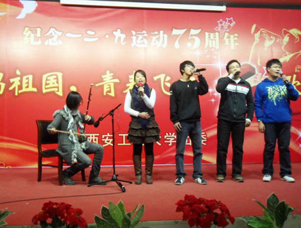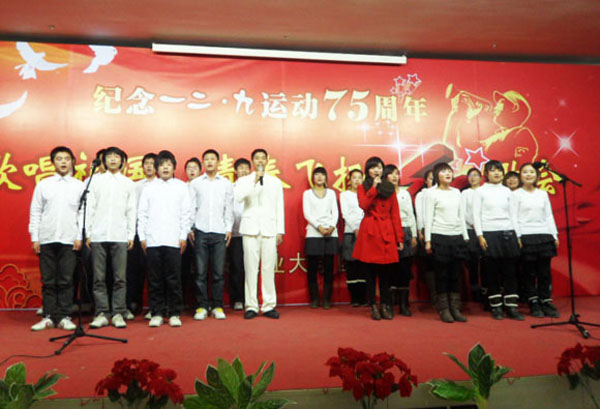 (本网讯)12月8日晚,IM在线团委在未央校区举办纪念“一二·九运动”75周年——“歌唱祖国 青春飞扬”红歌会。之前,校团委宣传部对来自不同院系、不同年级的30余个报名的曲目,进行了初审、复审等环节,最终挑选了14个优秀的表演团队及个人登台演唱。