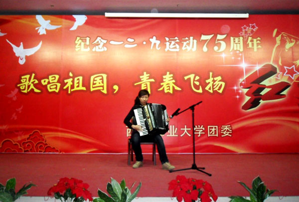 一曲手风琴独奏《北京喜讯到边塞》拉开了本场红歌会的序幕,精彩纷呈的红歌演唱以各自独特的方式呈现在大家面前。载歌载舞的《红星照我去战斗》以新的形式唱出了当代大学生的激情,表演者还用萨克斯、手风琴、二胡等乐器配合演唱,重新演绎了《游击队之歌》、《浏阳河》、《歌唱祖国》等经典红歌。这些歌曲高亢激昂,感动着每一个在场的同学,同时也赢得了阵阵掌声和喝彩。