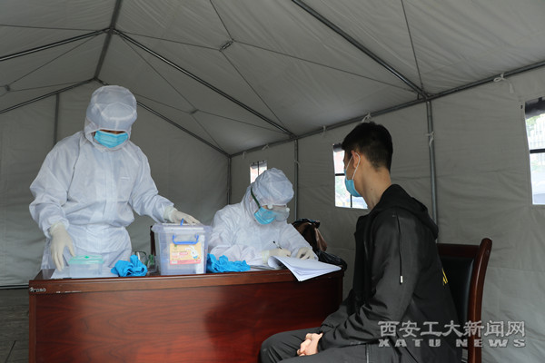 随着祁玉龙宣布“演练开始”的一声令下,“返校学生”戴着口罩、手持健康码,依次通过红外热成像测温舱。其中一名“发热”学生很快被现场安保人员发现,并引导其走专用通道,到达临时隔离点。校医院护士给该学生加戴外科口罩,并用水银体温计复测体温,同时询问其流行病学史……“返校学生”开学入校核验身份、体温异常应急处理有序进行。