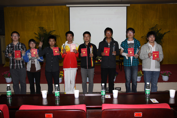 本届共评选出八个感动校园人物,有为了丰富同学们的校园生活,放弃了许多原本可以放松娱乐的时间,默默付出,静静等待只为了更多绽放的笑脸的学生会主席——王储;有那个执着向梦想不断前进,喜欢在科技的海洋里创造自己世界的彭亮。当然,那个热衷于创业,有着初生牛犊不怕虎的胆识,在校园里创建“那儿”酒吧的山育泉也让我们印象深刻。以及为了自己心爱的足球运动,带领团队不断拼搏,不惜受伤,不顾家人反对的梁云龙。还有那个面对困境也不曾选择放弃,用勤奋与坚持为梦想打拼,最后获得成功的李娟。袁永,用自己并不宽厚的双手资助着云南的一所贫困小学,他省吃俭用,在课余时间打工赚钱只为了不曾相识的贫困孩子们。白玉龙,作为一个志愿者,他排除万难帮助一个困难家庭的小女孩治好了患病已久的眼睛,他的事迹也许不是惊天动地,但是他让小女孩看清了这个温暖的世界。杨阳,当听到汶川发生地震,本来就很贫困的他捐出了他仅有的生活费,震后不久他还前往灾区当起了义工,帮助那些更需要帮助的人们。这八个感动校园人物的事迹虽然都各不相同,但是他们都拥有一颗热情善良的心,他们身上都有那么一种精神,那种打动你我、激励你我不断向前的精神。
