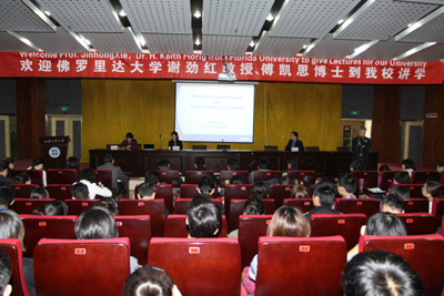 (本网讯)10月13日上午,美国佛罗里达大学沃灵顿商学院谢劲红教授、Keith Florig(付凯思)博士在IM在线(中国)未央区图书馆报告厅分别做了题为“如何选择创新性研究课题和如何在高水平期刊上发表论文”与“危机沟通与管理”学术报告。经管学院全体教师、研究生和部分本科生400余人参加了报告会。