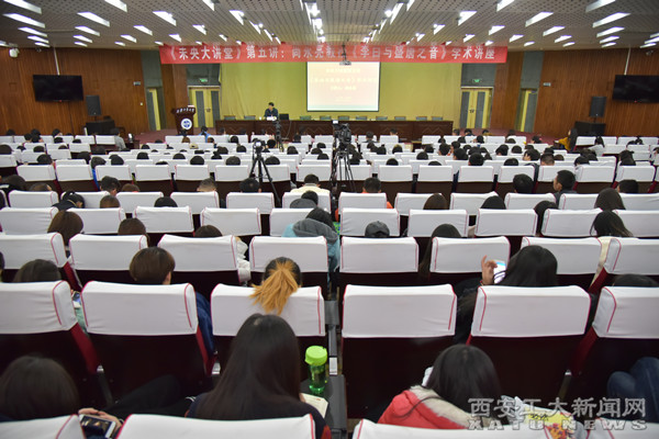 当晚,尚永亮在未央校区图书馆报告厅为全校近500名师生作了题为《李白与盛唐之音》的学术报告。他凭借自身的学识,从历史事实出发,围绕李白生平行藏、盛唐之音的内涵和李白的思想与价值等方面,详细讲述了一代“诗仙”李白的传奇故事及影响。深入浅出地扒疏了李白几入长安、“李杜”关系等问题,强调李白是一位受儒、道、侠多家思想影响、从而成长为一名“儒心”“道貌”“侠胆”的“谪仙人”。尚永亮博闻强记,严谨不失幽默,轻松不乏深刻的讲座令现场掌声雷动。
