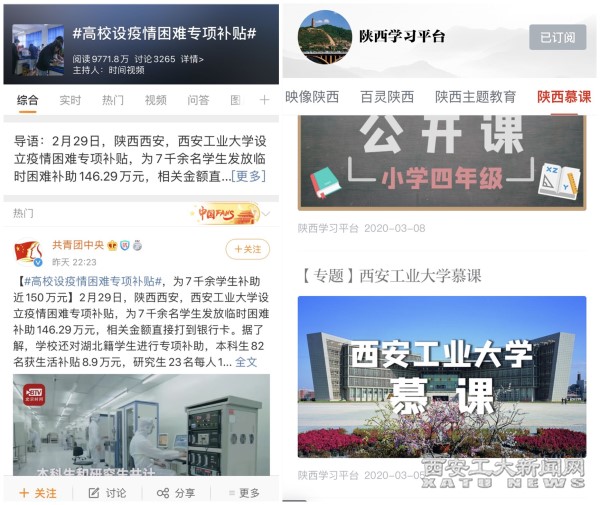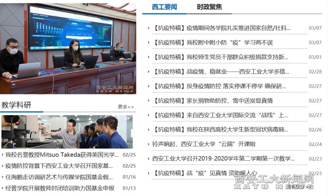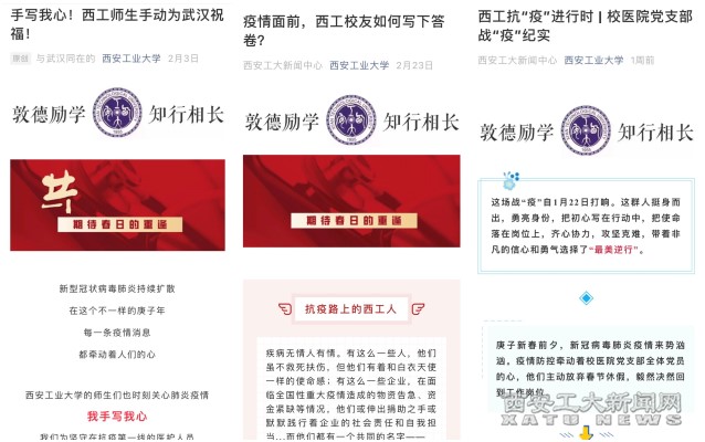 在这场疫情阻击战中,学校坚守校媒阵地,坚持价值引领,弘扬爱国主义,传递科学信息,凝聚IM在线力量,用镜头、用笔尖记录了特殊时期西安工大人的初心和使命。