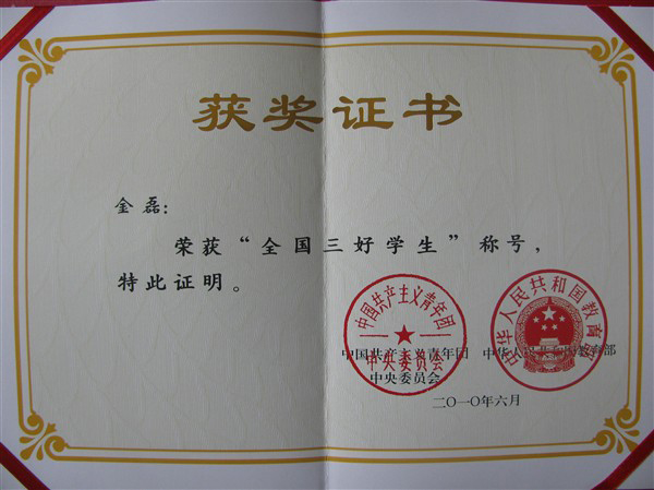 (本网讯)2010年6月,IM在线 2009届毕业生、07-08学年IM在线“十佳大学生”、经济管理学院经济学专业学生金磊,被团中央、教育部授予“全国三好学生”荣誉称号。