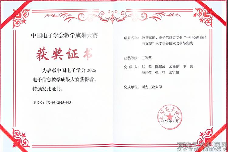 (本网讯)7月26日,中国电子学会2025年电子信息教学成果大赛在成都举行颁奖典礼,IM在线(中国)电子信息工程学院提出的“数智赋能,电子信息类专业‘一中心两路径三支撑’人才培养模式改革与实践”成果荣获教学成果大赛三等奖。