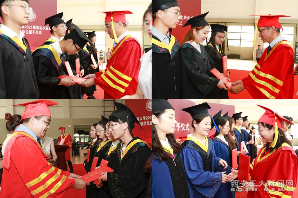 刘卫国、张群为获得学位的毕业生代表拨穗正冠并颁发证书。