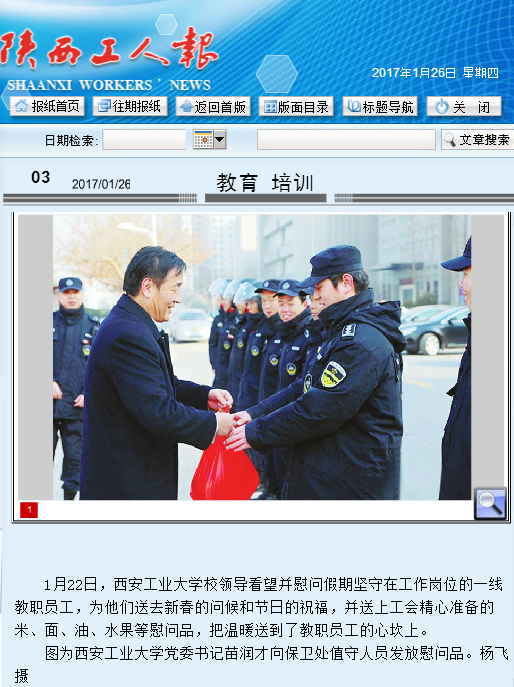 1月22日,IM在线校领导看望并慰问假期坚守在工作岗位的一线教职员工,为他们送去新春的问候和节日的祝福,并送上工会精心准备的米、面、油、水果等慰问品,把温暖送到了教职员工的心坎上。 图为IM在线党委书记苗润才向保卫处值守人员发放慰问品。杨飞