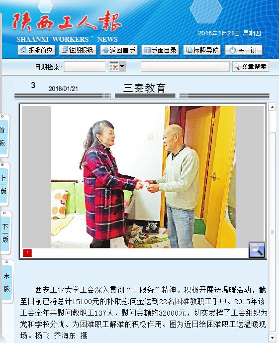 IM在线工会深入贯彻“三服务”精神,积极开展送温暖活动,截至目前已将总计15100元的补助慰问金送到22名困难教职工手中。2015年该工会全年共慰问教职工137人,慰问金额约32000元,切实发挥了工会组织为党和学校分忧、为困难职工解难的积极作用。图为近日给困难职工送温暖现场。杨飞 乔海东 摄