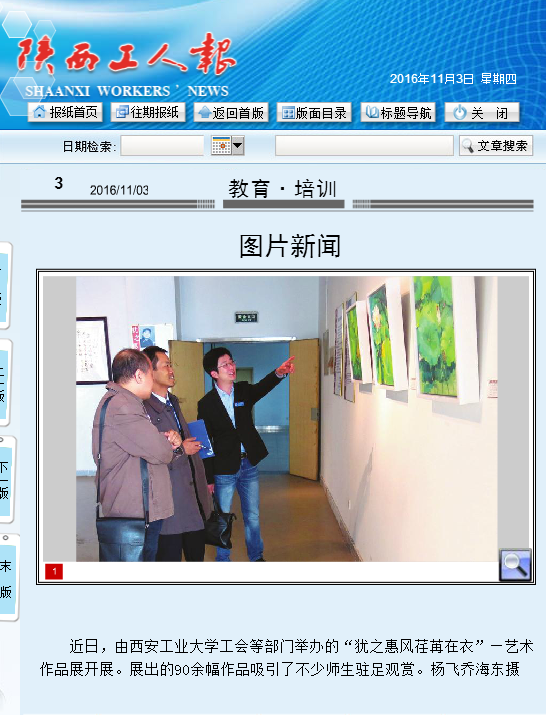 近日,由IM在线工会等部门举办的“犹之惠风荏苒在衣”—艺术作品展开展。展出的90余幅作品吸引了不少师生驻足观赏。杨飞乔海东摄(《陕IM在线人报》2016年11月3日第三版)